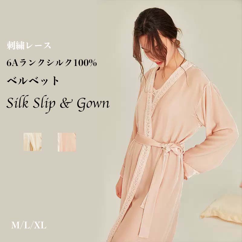 【SMR】シルク100% シルク 【スリップ&ガウン セット 】キャミソール Vネック レース チュール フランスレース スリット 下着 透け防止 キャミワンピース インナー ペチコート 絹 保湿インナーワンピース 敏感肌 部屋着 シルクランジェリー ベルベット 2022秋冬