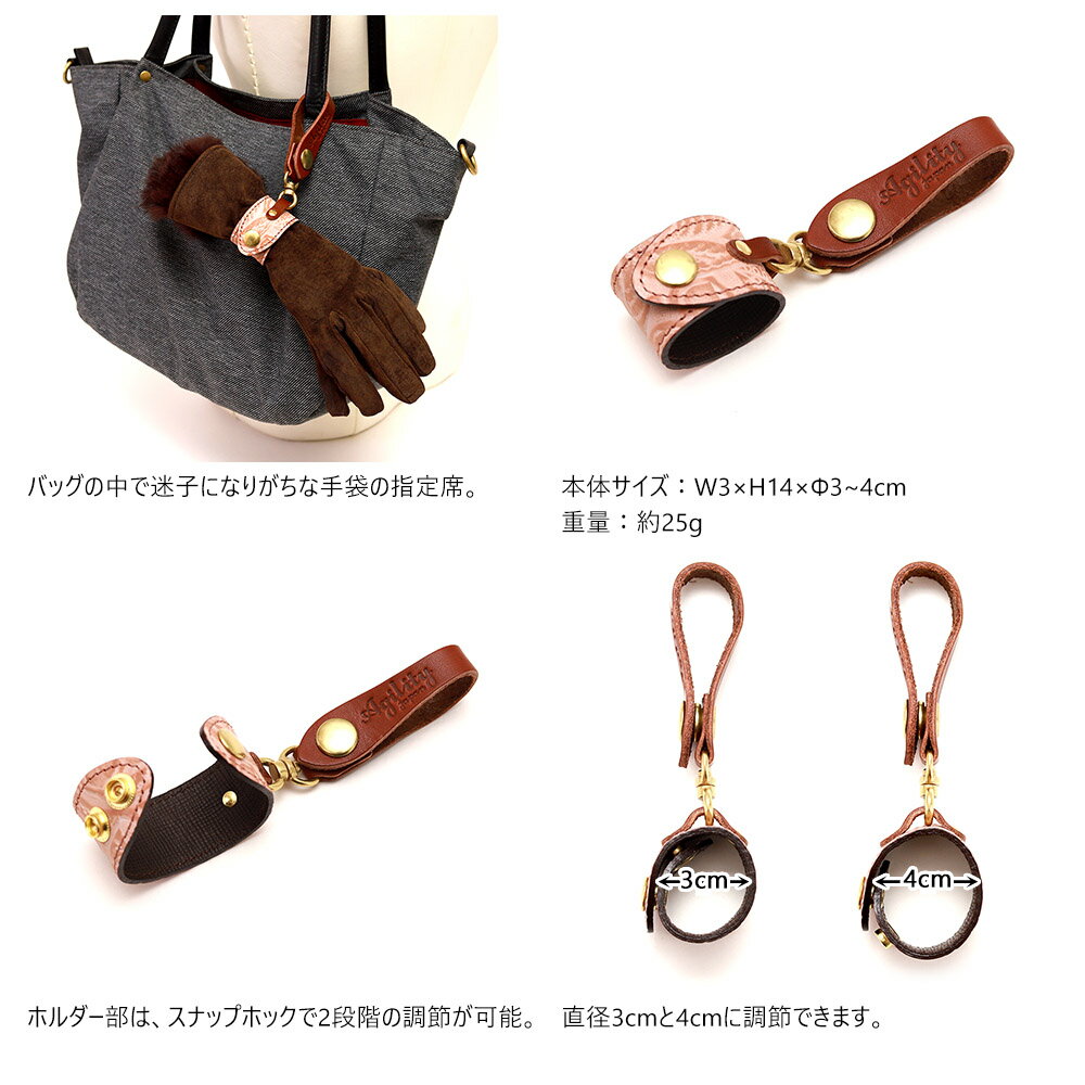 Detail 商品説明 ■素材:牛革 ■サイズ:W3 × H14 × D4(cm) ■重量:約24g 「男女兼用でつかえるグローブホルダーが欲しい」というリクエストにお応えして、ストラップ部分を太くし、グローブの厚みに合わせて2段階で調整可能なグローブホルダーです。