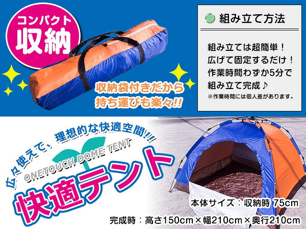簡単組み立て! ワンタッチ式 ドーム型 テント 2人から3人用! キャンプ アウトドア ワンタッチテント ドームテント ブルー オレンジ 簡易テント 海 BBQ ピクニック 日除け 日傘 レジャー プール サンシェードテント UVカット 紫外線カット 日焼け対策