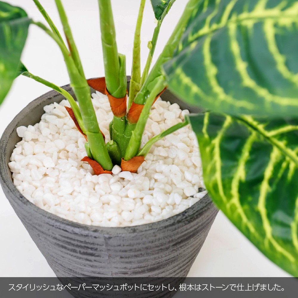 特徴鮮やかなグリーンの葉に黄色の斑が入ったエキゾチックな熱帯観葉植物の代表格・ディフェンバキアをスタイリッシュなペーパーマッシュポットにセットしました。